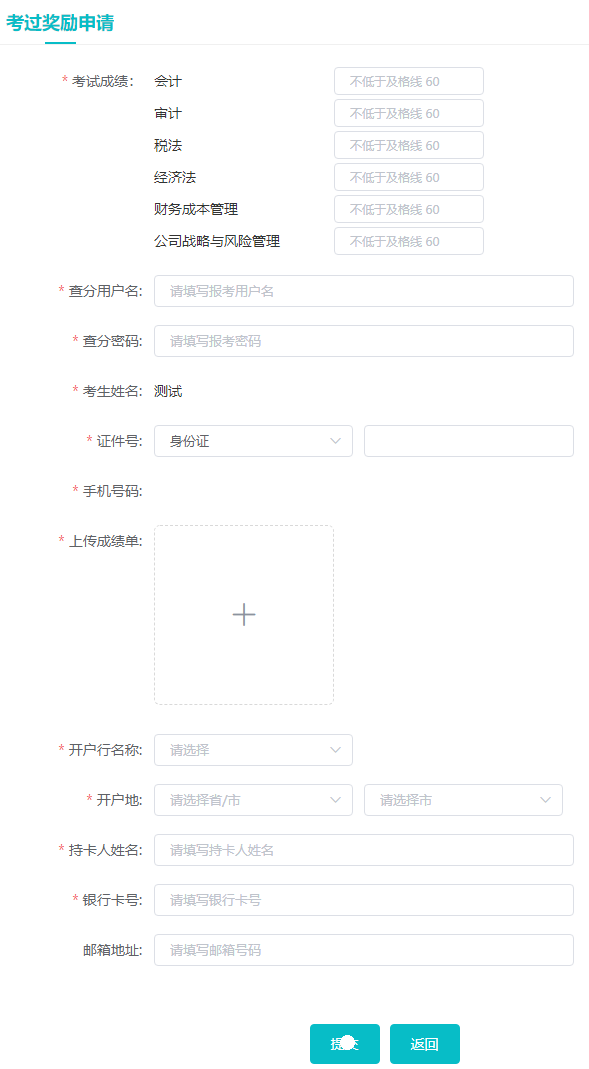 3、依次填入考试分数、查分用户名、密码、等个人信息,并上传成绩单截图后,点击提交按钮。