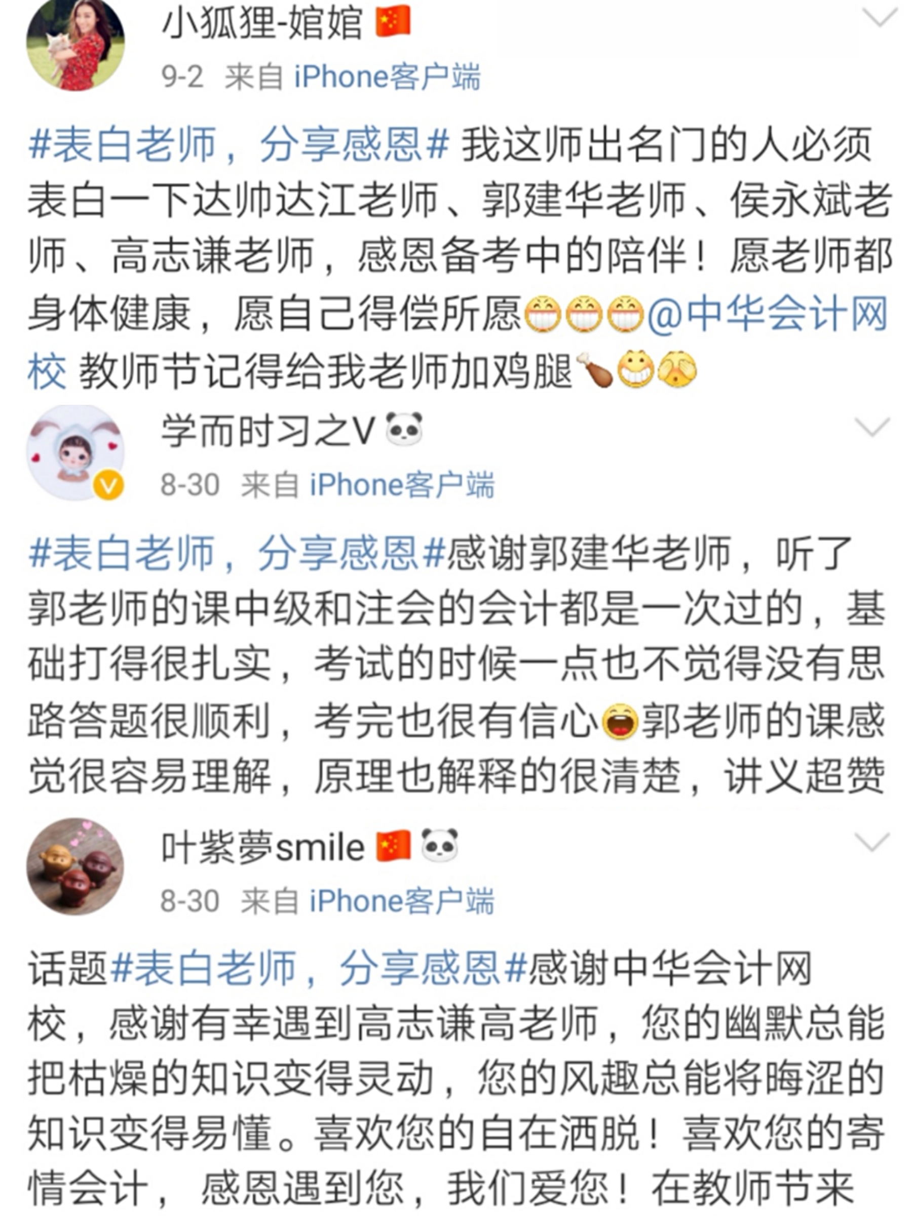 在这次微博话题互动中,有很多考生都表达了对老师的感激之情,小编也只截取了部分表白注会老师的微博截图,更多精彩表白,在微博搜索#表白老师,分享感恩#即可获取!在这个话题里面,也可以帮助那些不知道选哪个老师课程的学员们解忧哦!毕竟都说好的,有他独特的魅力吸引各位去学习!2020年选课>>
