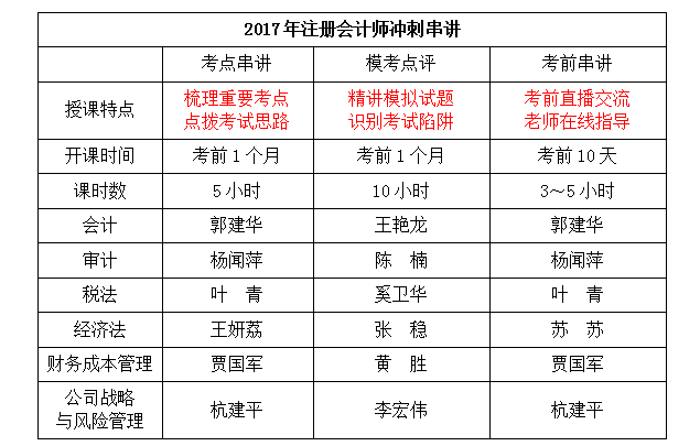 2017年注册会计师考试冲刺串讲课程已经开通啦!抓住仅剩一个月的备考时间,从各章节重要考点难点到考前系统性的模拟试题再到考前十天的老师直播,全方位的冲刺串讲学习助力2017年CPA考试。