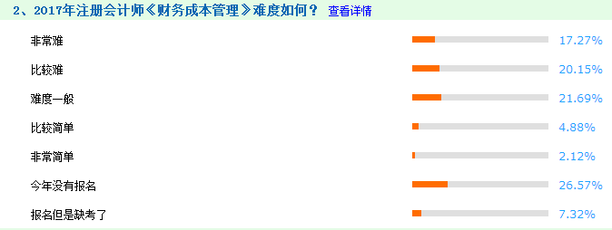 本次调查参与人数共计2655人,调查显示,17.27%的考生认为试题非常难,20.15%的考生认为试题比较难,21.69%的考生认为考试难度一般,4.88%的考生认为试题比较简单,2.12%的考生认为试题非常简单。对比去年的调查结果可知,2017年注会《财管》考试难度略有提升,主要是因为计算量大,因此不少考生因为机考和计算器操作而耽误时间。