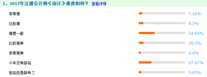 本次调查参与人数共计2655人,调查显示,7.42%的考生认为试题非常难,9.5%的考生认为试题比较难,34.65%的考生认为考试难度一般,10.5%的考生认为试题比较简单,4.4%的考生认为试题非常简单。对比去年的调查结果可知,2017年注会《审计》考试难度确实有所下降。