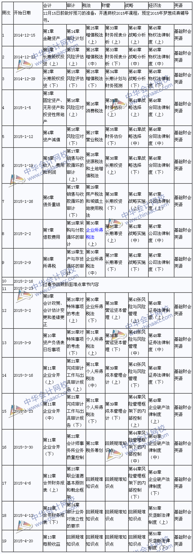 1.整体进度说明:本计划表从2014年12月15日开始执行,计划于2015年4月25日结束,共计19周;学员可根据本表的提示,结合自己的时间安排、学习情况进行细化,并按网校要求完成听课、做题的学习任务,基本可满足考试需要。