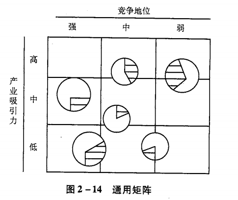 通用矩阵不仅适用于波士顿矩阵所能使用的范围,而且对不同需求、技术寿命周期曲线的各个阶段以及不同的竞争环境均可使用。