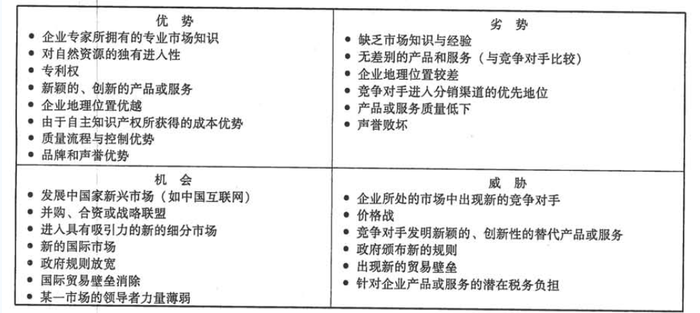 (4)T——企业外部环境的威胁,如新竞争对手的出现、市场增长缓慢、购买者和供应商讨价还价能力增强、技术老化等。