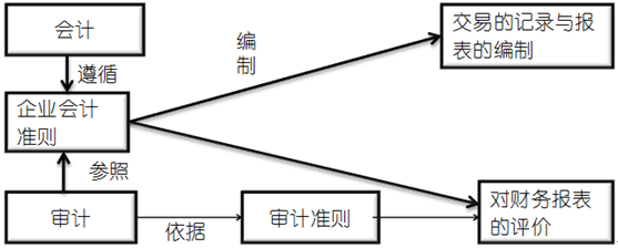 3.审计依据是“既定标准”。如果从2013年《审计》教材看,根据第五章第一节的财务报表审计总体目标与审计工作前提,或者根据《中国注册会计师审计准则第1101号——注册会计师的总体目标和审计工作的基本要求》第六条,这里的“既定标准”即为“适用的财务报告编制基础”。与此同时,实践工作中的会计工作与审计工作的关联也是这个“既定标准”。企业会计工作是会计人员遵循“既定标准”对“交易的记录与报表的编制”(如下图1-3),审计工作是审计人员遵循审计准则的要求参照“既定标准”(如上图1-2)对“经济活动与经济事项认定”进行再认定的过程。