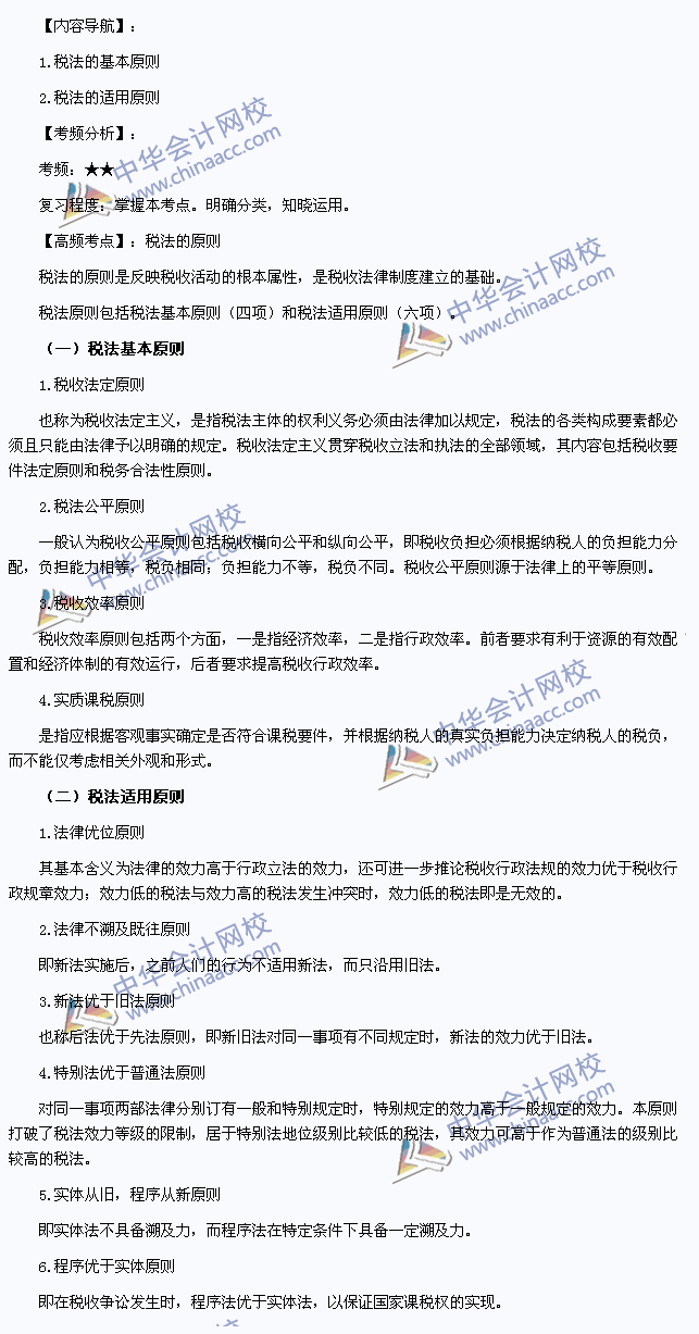 我们一起来学习2013注册会计师《税法》高频考点:税法的原则。本考点属于《税法》第一章税法总论第一节税法的概念的内容。