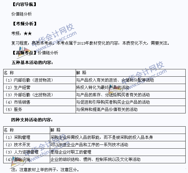 我们一起来学习2013注册会计师《公司战略与风险管理》高频考点:价值链分析。本考点属于《公司战略与风险管理》第二章战略分析第二节企业内部环境分析的内容。
