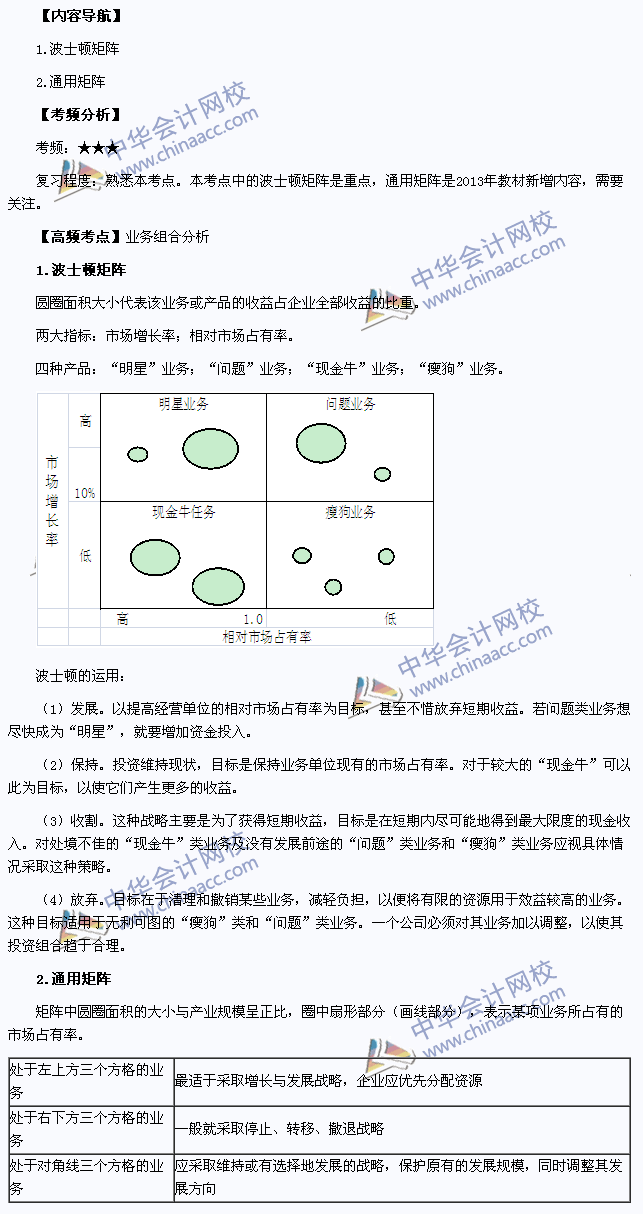 我们一起来学习2013注册会计师《公司战略与风险管理》高频考点:业务组合分析。本考点属于《公司战略与风险管理》第二章战略分析第二节企业内部环境分析的内容。
