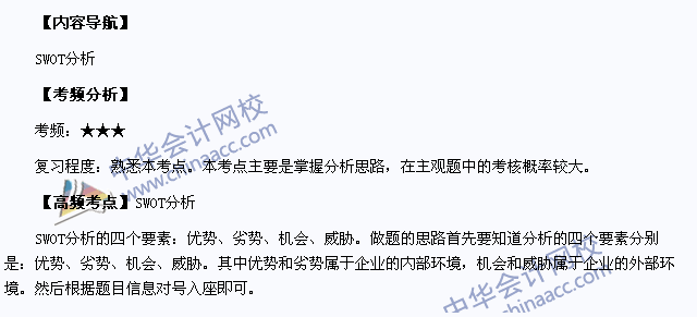 我们一起来学习2013注册会计师《公司战略与风险管理》高频考点:SWOT分析。本考点属于《公司战略与风险管理》第二章战略分析第二节企业内部环境分析的内容。