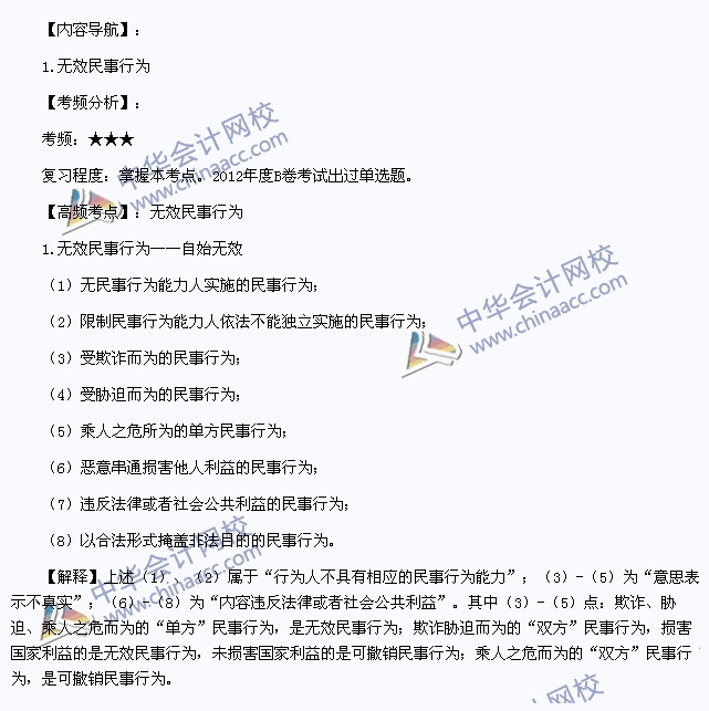 我们一起来学习2013注册会计师《经济法》高频考点:无效民事行为。本考点属于《经济法》第二章基本民事法律制度第一节民事法律行为制度的内容。