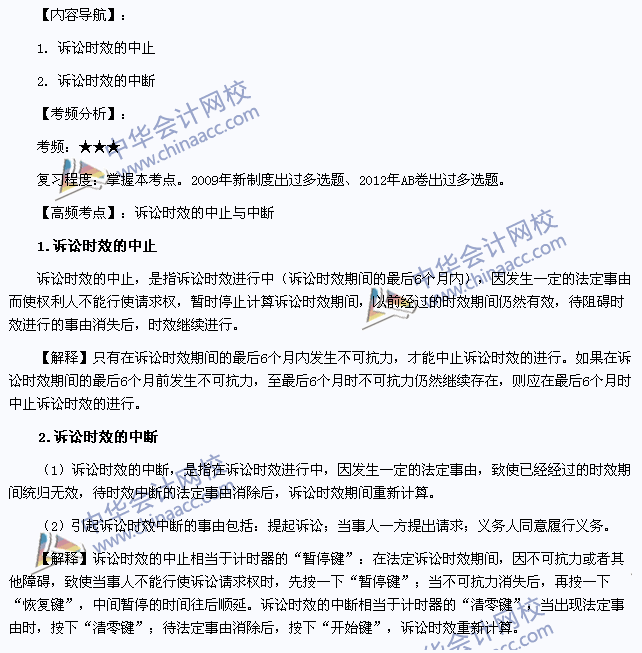 我们一起来学习2013注册会计师《经济法》高频考点:诉讼时效的中止与中断。本考点属于《经济法》第二章基本民事法律制度第三节诉讼时效制度的内容。