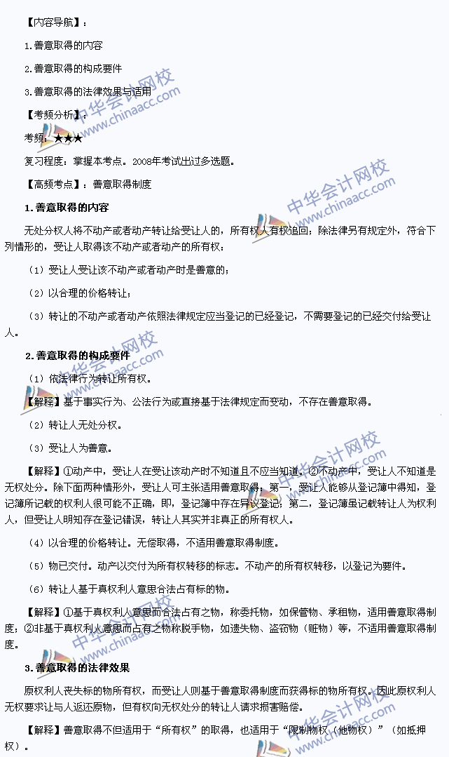 我们一起来学习2013注册会计师《经济法》高频考点:善意取得制度。本考点属于《经济法》第三章物权法律制度第三节所有权的内容。
