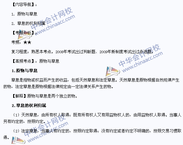 我们一起来学习2013注册会计师《经济法》高频考点:原物与孳息。本考点属于《经济法》第三章物权法律制度第一节物权法律制度概述的内容。