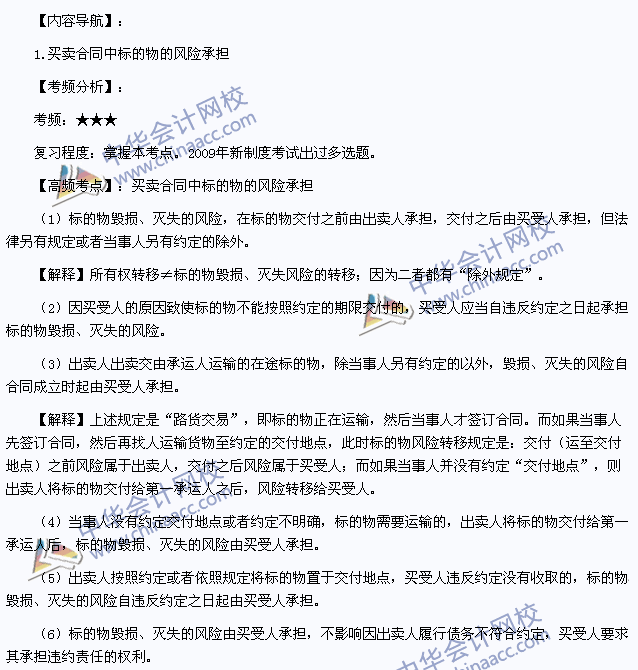 我们一起来学习2013注册会计师《经济法》高频考点:买卖合同中标的物的风险承担。本考点属于《经济法》第四章合同法律制度第九节几类主要的有名合同的内容。