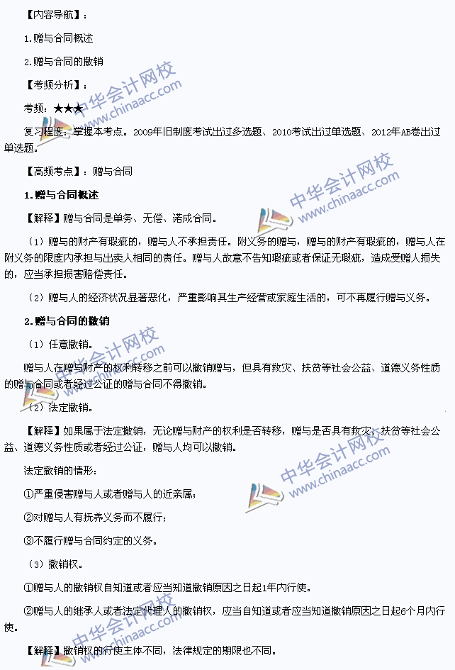 我们一起来学习2013注册会计师《经济法》高频考点:赠与合同。本考点属于《经济法》第四章合同法律制度第九节几类主要的有名合同的内容。