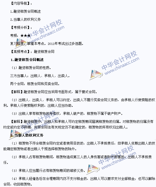 我们一起来学习2013注册会计师《经济法》高频考点:融资租赁合同。本考点属于《经济法》第四章合同法律制度第九节几类主要的有名合同的内容。