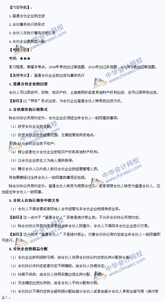 我们一起来学习2013注册会计师《经济法》高频考点:普通合伙企业的出资与事务执行。本考点属于《经济法》第五章公司法律制度第二节非公司型企业的内容。
