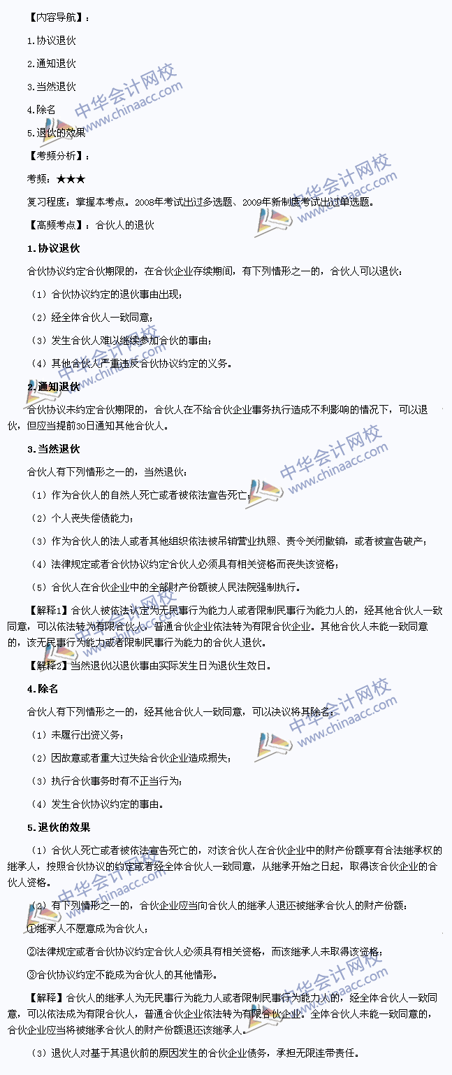 我们一起来学习2013注册会计师《经济法》高频考点:合伙人的退伙。本考点属于《经济法》第五章公司法律制度第二节非公司型企业的内容。