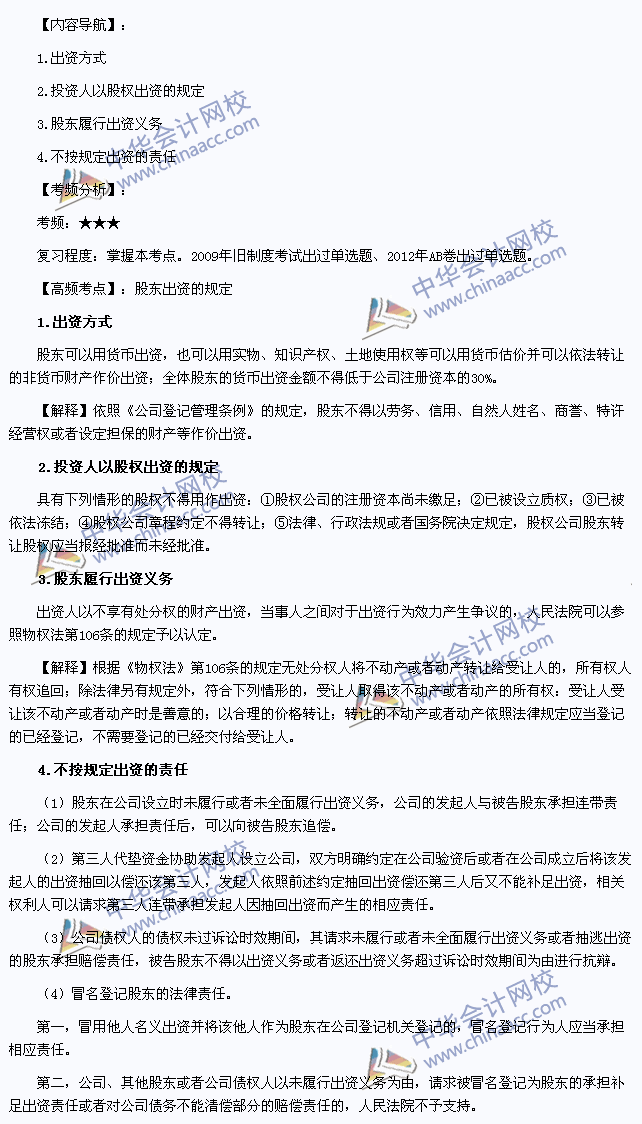 我们一起来学习2013注册会计师《经济法》高频考点:股东出资的规定。本考点属于《经济法》第五章公司法律制度第四节股份有限公司的内容。
