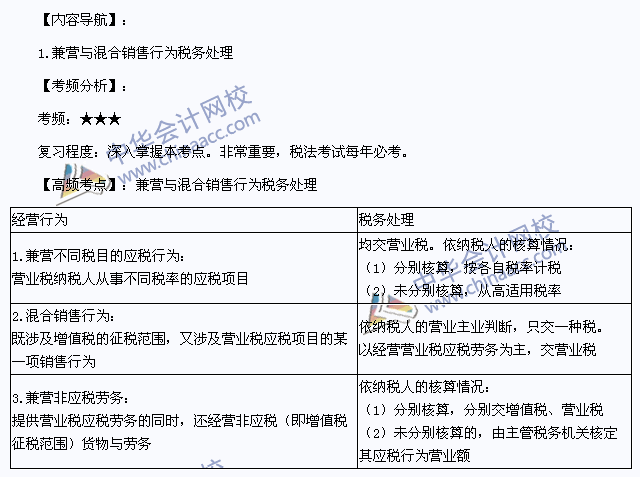 我们一起来学习2013注册会计师《税法》高频考点:兼营与混合销售行为税务处理。本考点属于《税法》第四章营业税法第四节应纳税额的计算与特殊经营行为的税务处理的内容。