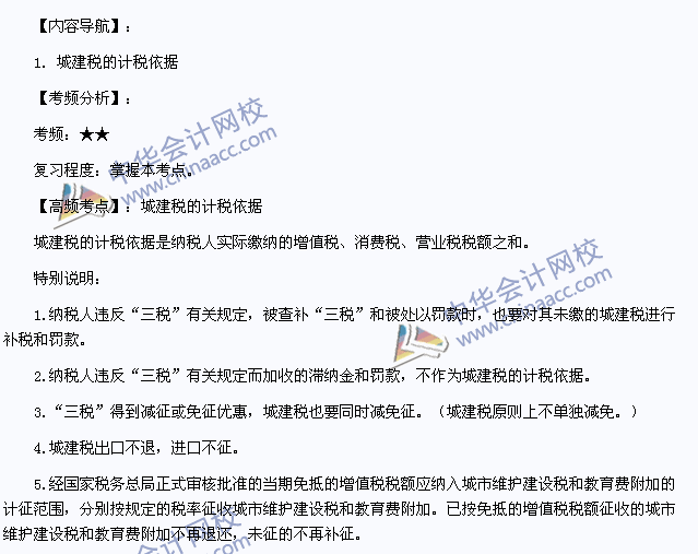 我们一起来学习2013注册会计师《税法》高频考点:城建税的计税依据。本考点是《税法》第五章城市维护建设税法和烟叶税法第一节城市维护建设税法的内容。