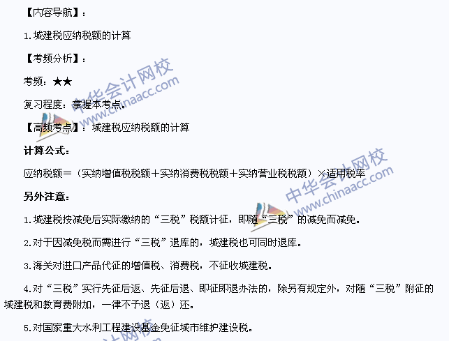 我们一起来学习2013注册会计师《税法》高频考点:城建税应纳税额的计算。本考点是《税法》第五章城市维护建设税法和烟叶税法第一节城市维护建设税法的内容。