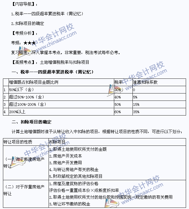 我们一起来学习2013注册会计师《税法》高频考点:土地增值税税率与扣除项目。本考点是《税法》第七章资源税法和土地增值税法第五节土地增值税税率、应税收入与扣除项目的内容。