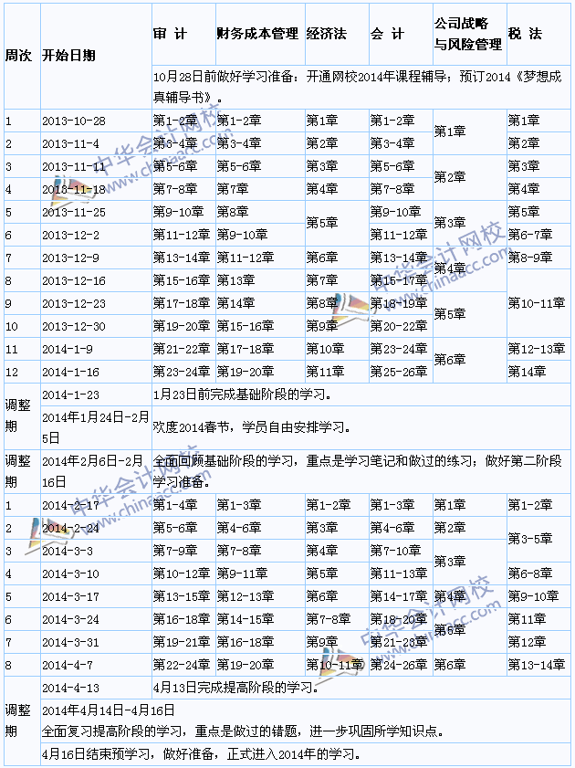 2、已报网校2014年注册会计师辅导精品班的同学,将由班主任老师根据您的财税基础及学习时间制定更详尽的计划表,如与本表不一致,请以班主任老师制定的学习计划为准。