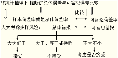 第二,非统计抽样结果的评价(在控制测试下将样本偏差率与可容忍偏差率比较;在细节测试下将总体错报与可容忍错报比较)