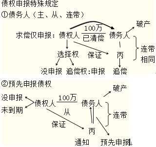 | 保证债务“尚未到期”,将其未到期之保证责任视为已到期,在减去未到期的利息后予以提前清偿。 | 对负“连带”责任的保证人可以直接申报债权求偿。 | |