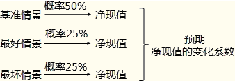 情景分析一般设定未来现金流量有三种情景:基准情景,即最可能出现的情况;最坏情况,即所有变量都处于不利水平;最好情况,即所有变量都处于最理想局面。根据不同情景的三组现金流量分别计算净现值,然后计算预期净现值及其离散程度。 【提示】采用这种方法,需要对每种情形出现的概率作出估计,如果难以估计,可以假定如下: ![]() |