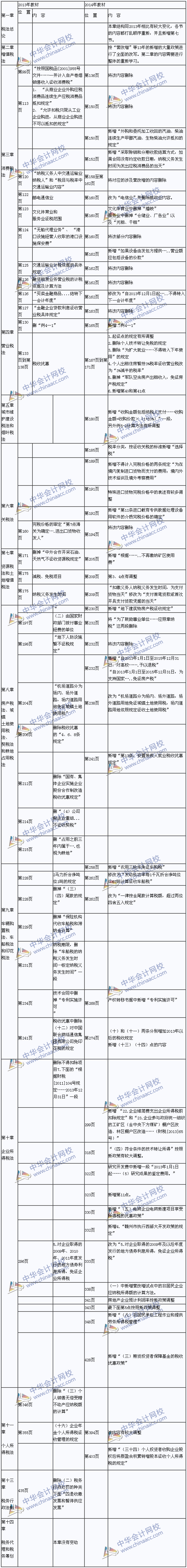 2014年注会税法教材变动比较大,第一章将原来各节的内容打乱顺序重新编写,而且新增加了一节;第二章也变动非常大,新增营改增的最新内容,增值税专用发票的使用和管理等内容也有不少调整;第四章营业税中删除不少涉及营改增的内容;企业所得税中新增校对最新政策法规,其他章节也有一些变动,相对变动要小一些。其中增值税、营业税、企业所得税都是非常重要的章节,建议学员都按照新教材的内容来学习。