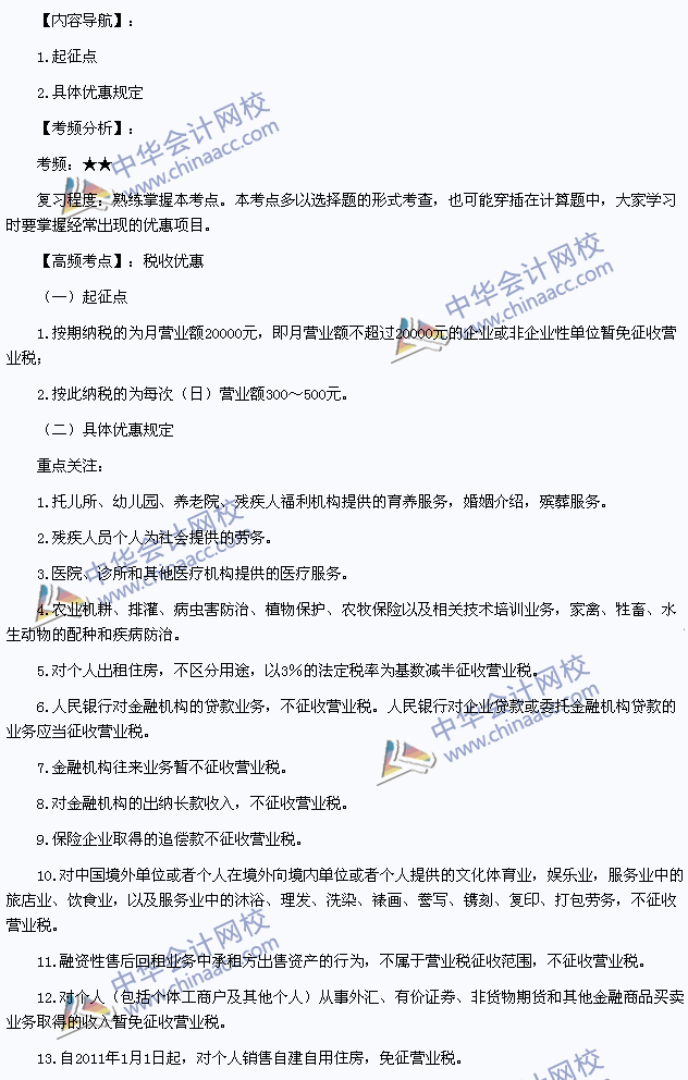 我们一起来学习2014年注册会计师《税法》高频考点:税收优惠。本考点属于《税法》第四章营业税法第五节税收优惠的内容。