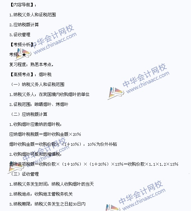 我们一起来学习2014年注册会计师《税法》高频考点:烟叶税。本考点属于《税法》第五章城市维护建设税和烟叶税法第二节烟叶税法的内容。