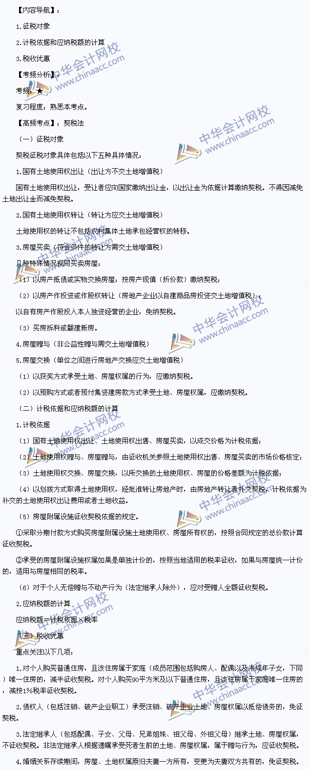 我们一起来学习2014年注册会计师《税法》高频考点:契税法。本考点属于《税法》第八章房产税法、城镇土地使用税法、契税法和耕地占用税法第三节契税法的内容。