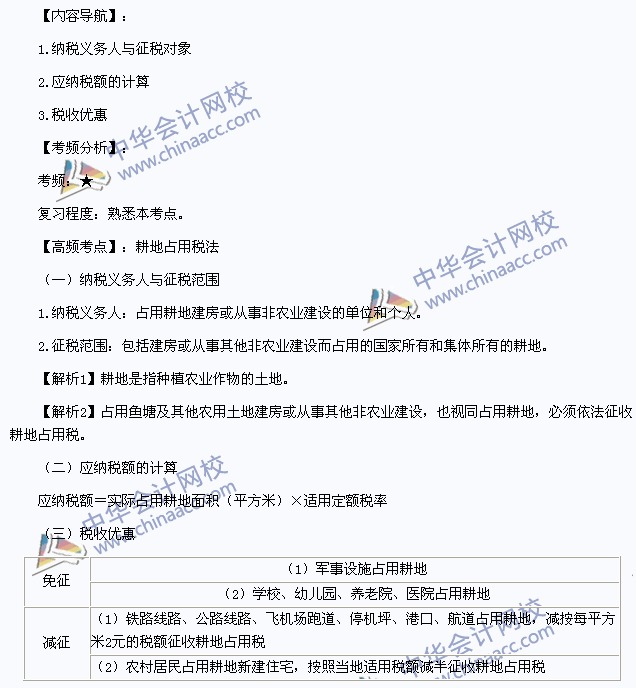 我们一起来学习2014年注册会计师《税法》高频考点:耕地占用税法。本考点属于《税法》第八章房产税法、城镇土地使用税法、契税法和耕地占用税法第四节耕地占用税法的内容。