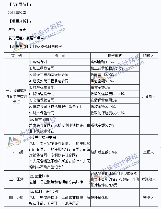 我们一起来学习2014年注册会计师《税法》高频考点:印花税税目与税率。本考点属于《税法》第九章车辆购置税法、车船税法和印花税法第三节印花税法的内容。