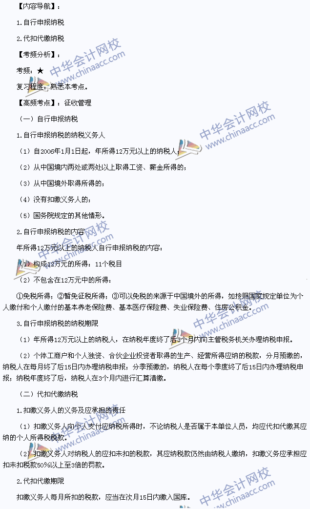 我们一起来学习2014年注册会计师《税法》高频考点:征收管理。本考点属于《税法》第十一章个人所得税法第六节征收管理的内容。
