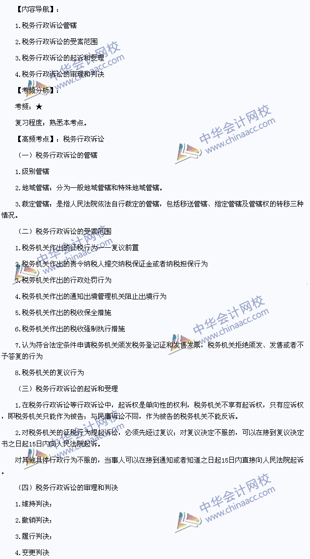 我们一起来学习2014年注册会计师《税法》高频考点:税务行政诉讼。本考点属于《税法》第十三章税务行政法制第三节税务行政诉讼的内容。