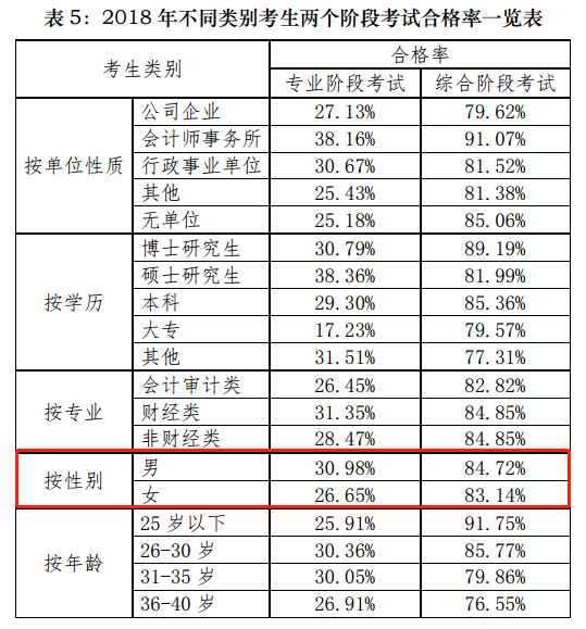 根据中注协发布的2018年注册会计师全国统一考试分析报告我们了解到,男性考生的合格率在专业阶段考试中略高于女性考生,在综合阶段考试中两者相差不大。其次,注会考试中一次过六科的大多是女学霸,具体如下: