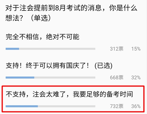 平地一声惊雷!网爆消息:2021年注会考试时间或将提前到8月份?针对此消息,网友评论已炸锅,一起来看看吧!其中36%的网友表示,这一次我不能支持中注协爸爸,注会太难了,我要有足够的备考时间。