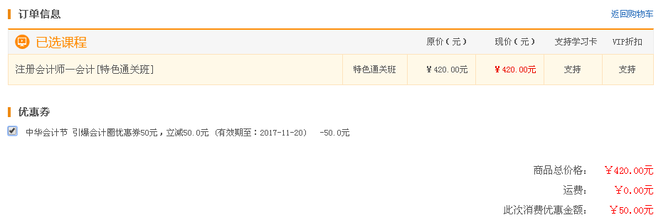 注:以上优惠券可在2017年11月20日24:00前用于购买正保会计网校任意课程、班次升级、转赠好友;每个订单限使用一张优惠券;可与VIP同时享用;继续教育、单班次、教材及辅导书除外。