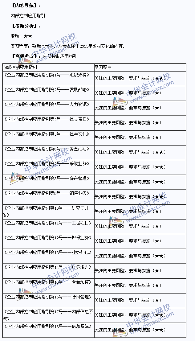 我们一起来学习2013注册会计师考试《公司战略与风险管理》高频考点:内部控制应用指引。本考点属于《公司战略与风险管理》第六章风险管理框架下的内部控制第四节内部控制应用指引的内容。