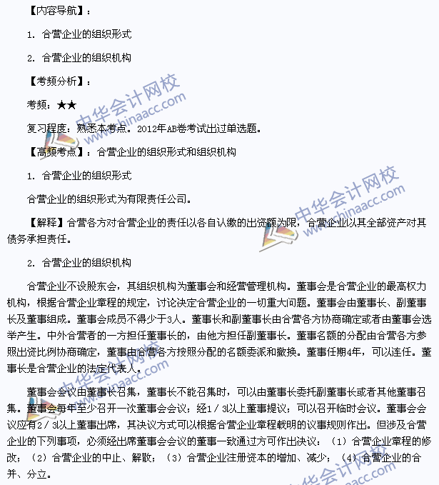 我们一起来学习2013注会考试《经济法》高频考点:合营企业的组织形式和组织机构。本考点属于《经济法》第十一章涉外经济法律制度第一节涉外投资法律制度的内容。