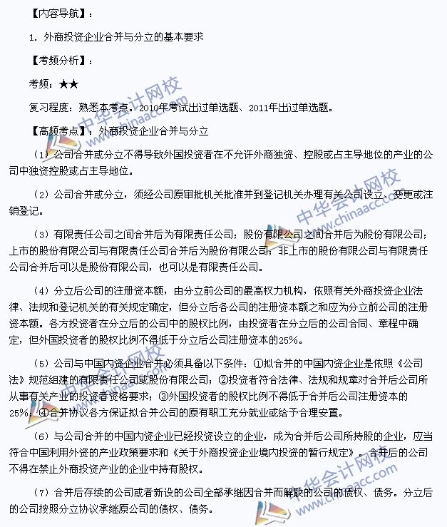 我们一起来学习2013注会考试《经济法》高频考点:外商投资企业合并与分立。本考点属于《经济法》第十一章涉外经济法律制度第一节涉外投资法律制度的内容。