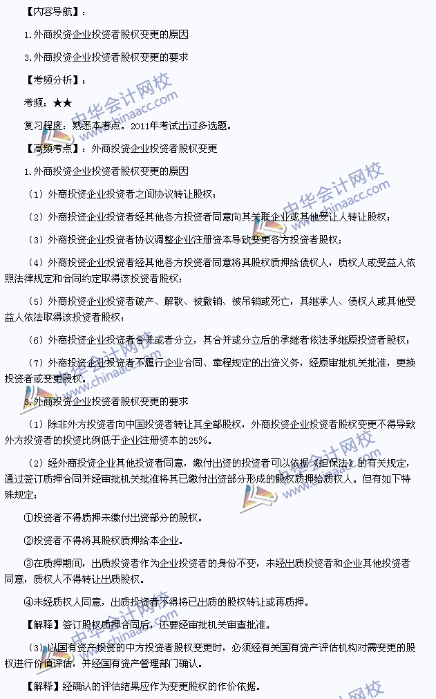 我们一起来学习2013注会考试《经济法》高频考点:外商投资企业投资者股权变更。本考点属于《经济法》第十一章涉外经济法律制度第一节涉外投资法律制度的内容。