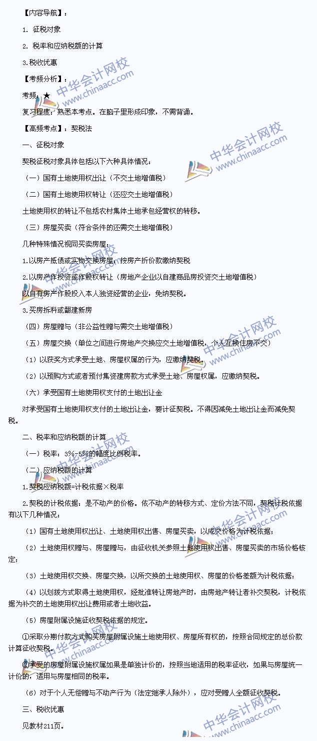 我们一起来学习2013注册会计师《税法》高频考点:契税法。本考点是《税法》第八章房产税法、城镇土地使用税法、契税法和耕地占用税法第三节契税法的内容。