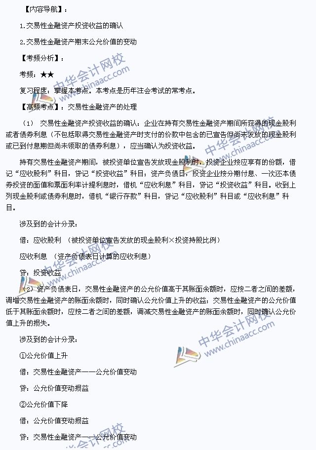 我们一起来学习2013注册会计师《会计》高频考点:交易性金融资产的处理。本考点属于《会计》第二章金融资产第二节以公允价值计量且其变动计入当期损益的金融资产的内容。