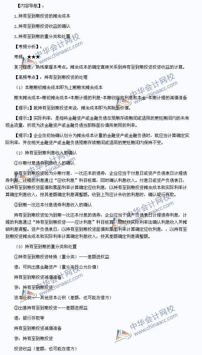 我们一起来学习2013注册会计师考试《会计》高频考点:持有至到期投资的处理。本考点属于《会计》第二章金融资产第三节持有至到期投资的内容。