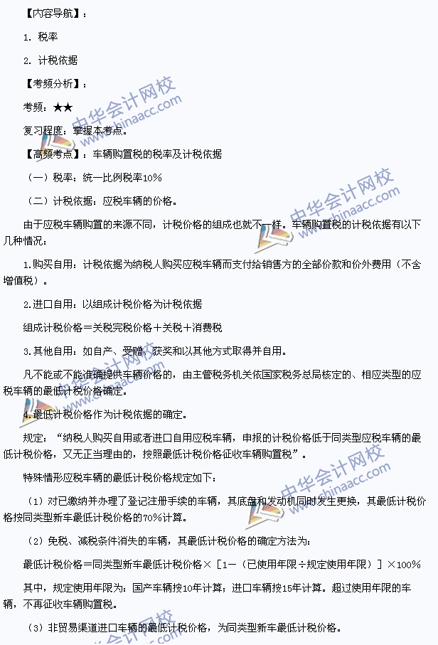 我们一起来学习2013注册会计师《税法》高频考点:车辆购置税的税率及计税依据。本考点是《税法》第九章车辆购置税法、车船税法和印花税法第一节车辆购置税法的内容。